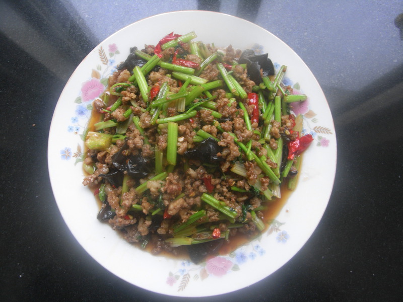 1、牛肉四两、香菜半斤、木耳红辣椒适量。
