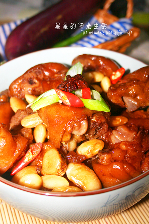 及以下步骤:葱姜蒜切好,八角,干辣椒,桂皮,陈皮备用 锅内留少许油,把葱姜蒜超香 把炸好的猪蹄开始炒 炒出香味以后,加入冰糖一把,二十三香,生抽,老抽,鸡精,料酒,蚝油,开始翻炒 加花椒水和雪碧没过猪蹄,加入干辣椒,八角,桂皮,陈皮,山药片 炖到剩下三分之二的水时候,加入泡好的雪豆,开始炖,开小火,炖一个小时,中间加一次水,在家一次生抽,加加一勺盐巴,料酒,继续炖 直到收汁为止 炖好出锅,加上葱段和辣椒段 看看这个颜色是不是很有食欲 看看这个颜色是不是很有食欲