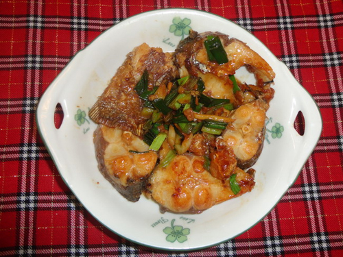 及以下步骤:起锅时加入蒜叶即可装盘了 鱼尾洗净控干水份备用 鱼切成块,加入姜丝,盐,鸡精,料酒、酱油、地瓜粉 鱼尾洗净控干水份备用 鱼切成块,加入姜丝,盐,鸡精,料酒、酱油、地瓜粉 腌5分钟 蒜苗切好备用 放鱼煎至金黄 翻一面煎至金黄,加少放料酒和蒜 起锅时加入蒜叶即可装盘了