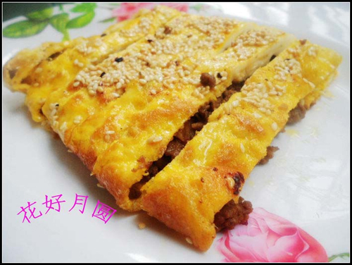 及以下步骤:锅内油热后下葱蒜爆香后,放入羊肉馅,加少许酱油炒变色后放入盐花椒粉,炒匀后出锅; 鸡蛋打散,摊成蛋饼 锅内油热后下葱蒜爆香后,放入羊肉馅,加少许酱油炒变色后放入盐花椒粉,炒匀后出锅; 鸡蛋打散,摊成蛋饼 锅内油热后下葱蒜爆香后,放入羊肉馅,加少许酱油炒变色后放入盐花椒粉,炒匀后出锅; 鸡蛋打散,摊成蛋饼 锅内油热后下葱蒜爆香后,放入羊肉馅,加少许酱油炒变色后放入盐花椒粉,炒匀后出锅; 把蛋饼铺平,上面放炒好的肉馅 四周叠起,形成四方形,边上抹水淀粉,鸡蛋盒两面醮满芝麻. 上煎锅两面煎一下即可,盛出后切条状装盘即可.