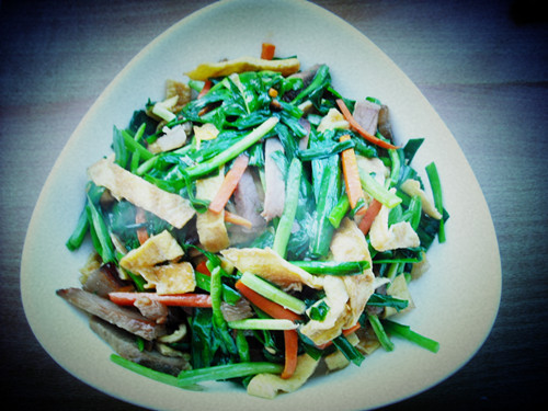 7、一盘颜色鲜艳很有卖相的韭菜炒三丝上桌了,被我们吃个精光