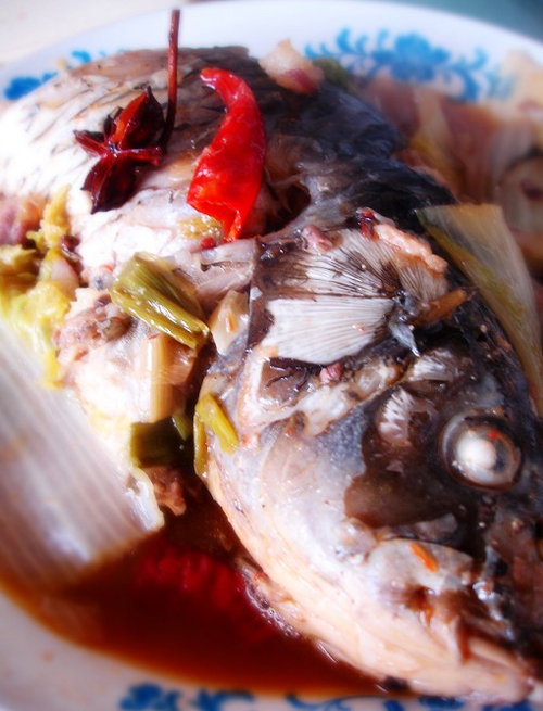 及以下步骤:放入鲤鱼(鱼太大,锅放不下,就切了一半放入锅里)。 加入少量生抽,料酒,一勺粗盐,大火烧开,沿着锅边淋米醋。 转中火盖上锅盖儿炖熟。 锅烧热,倒入少量豆油,加入肥肉煸炒2-3分钟。 加入葱,姜,干辣椒,花椒,八角,13香炒香。 倒入辣酱(可根据口味适量添加)炒香。 加入开水,末过鲤鱼。 放入鲤鱼(鱼太大,锅放不下,就切了一半放入锅里)。 加入少量生抽,料酒,一勺粗盐,大火烧开,沿着锅边淋米醋。 转中火盖上锅盖儿炖熟。