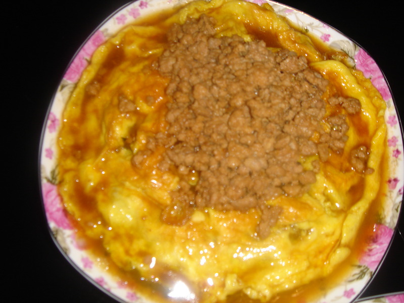 5、在锅中倒入油将肉沫炒制7,8分熟加入酱油,蚝油,花椒面,稍许盐(依个人口味酌量添加),味精,添入稍许水淀粉勾芡出锅将肉沫倒在滑蛋上,即完成