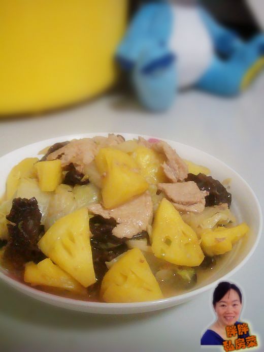 及以下步骤:放入葱姜煸炒。 倒入料酒、酱油、盐。 放入白菜翻炒均匀。 添加适量水。 先把木耳用热水焯一下,放入锅中翻炒。 放入菠萝块翻炒均匀。 放入鸡精、香油调味即可。 先把木耳用热水焯一下,放入锅中翻炒。 放入菠萝块翻炒均匀。 放入鸡精、香油调味即可。