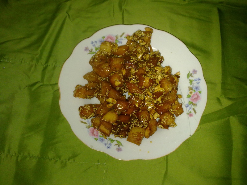 6、白糖熬到大泡变小泡而且微微发黄的时候下入馍丁,熟花生碎和熟芝麻,搅一搅马上出锅。