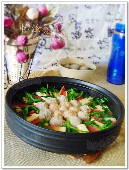 及以下步骤:分别把莲藕和葱姜放入肉馅中,另把胡萝卜和葱姜放入肉馅中。 反复把两种馅都搅拌均匀后加入鸡精和橄榄油少许搅拌均匀即可。 塔吉锅洗净预热倒入橄榄油少许。 把橄榄油刷或者抹在底部即可。 然后把快菜摆在锅内。 然后依次摆上豆腐和火腿片,中间用勺子把肉馅弄成丸子摆在中间即可。在上面撒上少许葱姜,鸡汤少许加入一些盐撒入。 盖上盖子煮开后边上 有水出来后转小火1-2分钟关火焖2分钟即可。 然后摆上焯水的豌豆尖装点一下好看一些。 做好的塔吉锅【什锦双色肉丸】上桌开吃了! 做好的塔吉锅【什锦双色肉丸】上桌开吃了!