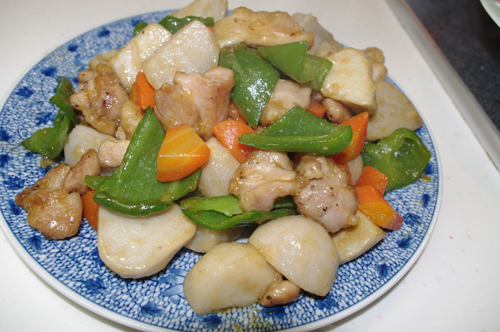 及以下步骤:将芋头,胡萝卜放入锅中,加入水刚好浸过为止,点火,水开之后转小火煮10分钟,捞出沥干水分。 将鸡腿肉切成一口大小,撒上胡椒和盐拌匀,放置5分钟,芋头与青椒切成一口大小,胡萝卜滚刀切,要切的稍微小一点。 将芋头,胡萝卜放入锅中,加入水刚好浸过为止,点火,水开之后转小火煮10分钟,捞出沥干水分。 将鸡腿肉切成一口大小,撒上胡椒和盐拌匀,放置5分钟,芋头与青椒切成一口大小,胡萝卜滚刀切,要切的稍微小一点。 将芋头,胡萝卜放入锅中,加入水刚好浸过为止,点火,水开之后转小火煮10分钟,捞出沥干水分。 将鸡腿肉切成一口大小,撒上胡椒和盐拌匀,放置5分钟,芋头与青椒切成一口大小,胡萝卜滚刀切,要切的稍微小一点。 将芋头,胡萝卜放入锅中,加入水刚好浸过为止,点火,水开之后转小火煮10分钟,捞出沥干水分。 将鸡肉和蔬菜分别撒上淀粉裹匀。 将平底锅烧热加油,把裹好淀粉的鸡肉放入锅中,用中火煎4分钟左右,待鸡肉熟了之后加入裹好淀粉的蔬菜开始翻炒。 稍微翻炒一会之后就可以加入酱油,白糖,料酒,稍微变得有些粘稠的时候即可入盘出锅了。