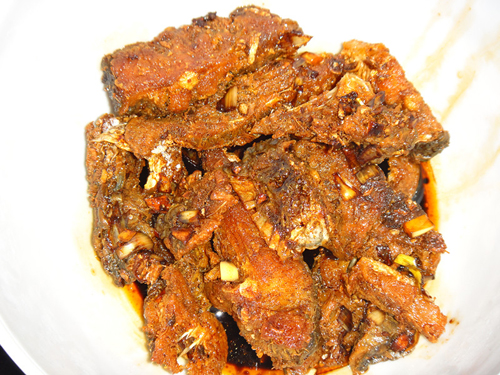 6、待两面都炸成金黄色以后,就可以将油锅中的鱼块直接放进调好的调料碗里,这时鱼块会不断冒泡并发出滋滋声,这是鱼块在吸收调料的味道。此乃“熏鱼”之真谛。
