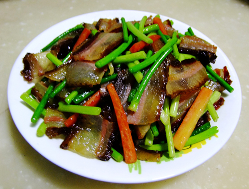 7、蒜薹和胡萝卜断生即可倒入刚炒好的腊肉,拌匀起锅,(味精会破坏腊肉的醇香)