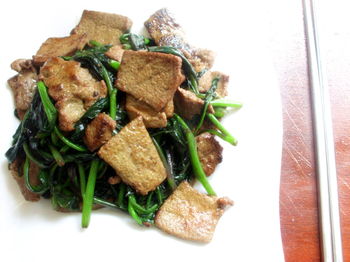 猪肝,菜都要炒得嫩才好吃,除了菜嫩以外,猪肝也要切对方向,然后大火快炒。这个菜小时候吃得多,是补血的。