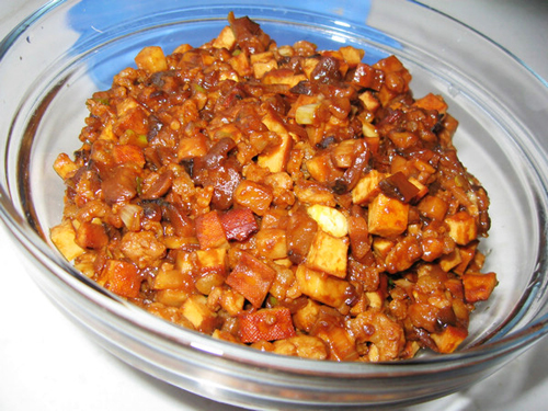 及以下步骤:炒熟后加入肉末,继续翻炒。 倒入酱料,炒到酱料沸腾并且和材料均匀混合后即可。 香菇、杏鲍菇、豆干切丁,葱姜切碎备用。 豆瓣酱、甜面酱、适量番茄酱、少量蚝油、白糖混合,用清水调匀备用。 锅中下少许油,放猪肉末煸炒。 炒到肉末变色并且出油后盛出,备用。 用肉末煸出的油爆香葱姜。 依次放入豆干、杏鲍菇、香菇煸炒。 炒熟后加入肉末,继续翻炒。 倒入酱料,炒到酱料沸腾并且和材料均匀混合后即可。