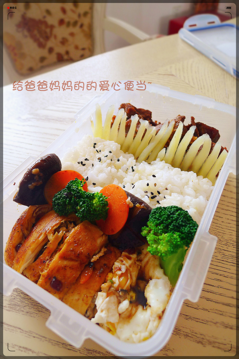 及以下步骤:用新鲜鸡胸肉片成薄薄的大片儿,里面包上用猪肉、香菇、胡萝卜、洋葱和酱油、香油、盐拌匀的馅儿,然后卷起成春饼状,最后用牙签固定,上笼屉蒸15分钟,取出放在平底锅里煎成微微发黄的漂亮颜色~~~(此时还不是照烧鸡肉卷哦~~)冷却,切厚片~~ 我用我可怜的味觉体会:用美极鲜、老抽和蜂蜜调制出日式照烧酱,味道和真正的照烧酱感觉差不多。。。。把米饭作为中心,红烧羊肉和照烧鸡肉卷摆好,用蔬菜点缀,在鸡肉卷上淋照烧酱,最后在米饭上撒上黑芝麻粒儿~~okay~ 用新鲜鸡胸肉片成薄薄的大片儿,里面包上用猪肉、香菇、胡萝卜、洋葱和酱油、香油、盐拌匀的馅儿,然后卷起成春饼状,最后用牙签固定,上笼屉蒸15分钟,取出放在平底锅里煎成微微发黄的漂亮颜色~~~(此时还不是照烧鸡肉卷哦~~)冷却,切厚片~~ 我用我可怜的味觉体会:用美极鲜、老抽和蜂蜜调制出日式照烧酱,味道和真正的照烧酱感觉差不多。。。。把米饭作为中心,红烧羊肉和照烧鸡肉卷摆好,用蔬菜点缀,在鸡肉卷上淋照烧酱,最后在米饭上撒上黑芝麻粒儿~~okay~ 用新鲜鸡胸肉片成薄薄的大片儿,里面包上用猪肉、香菇、胡萝卜、洋葱和酱油、香油、盐拌匀的馅儿,然后卷起成春饼状,最后用牙签固定,上笼屉蒸15分钟,取出放在平底锅里煎成微微发黄的漂亮颜色~~~(此时还不是照烧鸡肉卷哦~~)冷却,切厚片~~ 我用我可怜的味觉体会:用美极鲜、老抽和蜂蜜调制出日式照烧酱,味道和真正的照烧酱感觉差不多。。。。把米饭作为中心,红烧羊肉和照烧鸡肉卷摆好,用蔬菜点缀,在鸡肉卷上淋照烧酱,最后在米饭上撒上黑芝麻粒儿~~okay~ 红烧羊肉是早晨用高压锅焖出来的,直接装盒的时候用就可以,米饭蒸熟 用新鲜鸡胸肉片成薄薄的大片儿,里面包上用猪肉、香菇、胡萝卜、洋葱和酱油、香油、盐拌匀的馅儿,然后卷起成春饼状,最后用牙签固定,上笼屉蒸15分钟,取出放在平底锅里煎成微微发黄的漂亮颜色~~~(此时还不是照烧鸡肉卷哦~~)冷却,切厚片~~ 把蔬菜焯熟,2分钟烧开就差不多 我用我可怜的味觉体会:用美极鲜、老抽和蜂蜜调制出日式照烧酱,味道和真正的照烧酱感觉差不多。。。。把米饭作为中心,红烧羊肉和照烧鸡肉卷摆好,用蔬菜点缀,在鸡肉卷上淋照烧酱,最后在米饭上撒上黑芝麻粒儿~~okay~