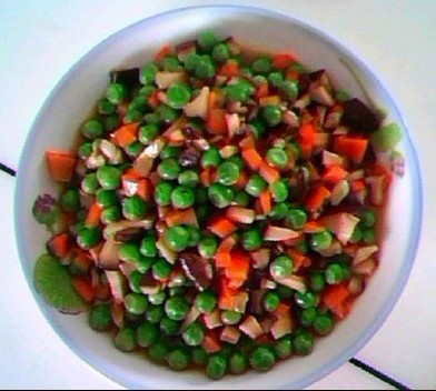 及以下步骤:香茹、碗豆粒、胡萝卜洗净待用 香茹、胡萝卜切粒 香茹、碗豆粒、胡萝卜洗净待用 香茹、胡萝卜切粒 香茹、碗豆粒、胡萝卜洗净待用 香茹、胡萝卜切粒 香茹、碗豆粒、胡萝卜洗净待用 香茹、胡萝卜切粒 碗豆粒放锅里焯,放点盐,出锅待用 放油烧热,然后倒入香菇粒翻炒至8成熟时放少许盐,再放入豌豆和胡萝卜丁,继续加少许水翻炒一小会,倒入淡淡酱油着色,待要出锅时倒入适量蚝油闷炒出汁,出锅盛盘!