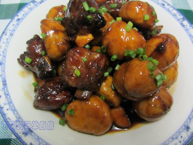及以下步骤:放入排骨和肉皮炒一炒 加点料酒,大约一小汤勺 加点大约两小汤勺老抽着色 放点碎冰糖翻炒抱歉!(相机没电池了,得,之后的加板栗;加盐;加水没过食材,盖过锅盖烧约15分钟,都没得拍了) 出锅装盘。 放入排骨和肉皮炒一炒 加点料酒,大约一小汤勺 加点大约两小汤勺老抽着色 放点碎冰糖翻炒抱歉!(相机没电池了,得,之后的加板栗;加盐;加水没过食材,盖过锅盖烧约15分钟,都没得拍了) 出锅装盘。