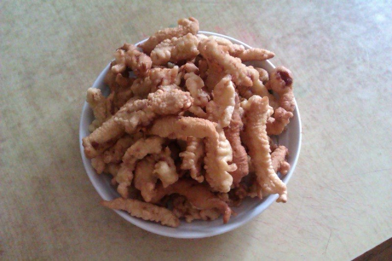 3、然后就是炸了 不建议把肉都放到面糊的碗里 我是放五六条然后夹到油锅里 忘记说油了 我也是实验着炸的 具体油温我还真说不准 还是老方法 放一条挂好糊的肉看情况 一条一条的都炸好了 再复炸一遍 我觉得面糊厚一点会很好吃