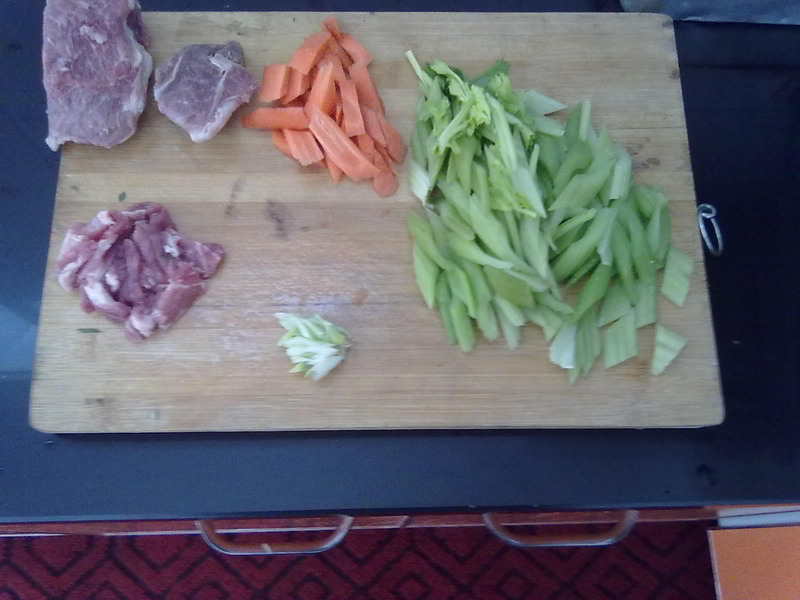 1、芹菜、胡萝卜洗净切菱形块,猪肉切片