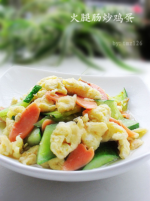 及以下步骤:黄瓜洗干净切菱形片。 火腿肠切片。 黄瓜洗干净切菱形片。 火腿肠切片。 黄瓜洗干净切菱形片。 火腿肠切片。 鸡蛋打散备用。 还是先炒蛋,依个人口味掌握几分熟。 然后倒进火腿翻炒。 待出锅时再把黄瓜放进去翻炒片刻,加盐调味即可盛出。