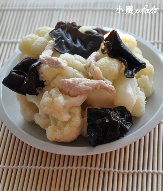 菜花---我们那里叫花菜,花菜炒肉片是一个非常家常的菜,做起来也很方便。以前在家里老爸烧这个菜,烧得很生,所以我觉得淡淡的一点都不好吃。现如今,身在德国,此地的蔬菜少之又少,而且经常看到网上说花菜是好东西,营养丰富,吃了对人体有好处。为了增加蔬菜在我们餐桌上的品种,同时也为了增加营养,我也开始做花菜了。 我喜欢把花菜炒的软一点,除了加肉丝,我还喜欢放点黑木耳,做好后觉得很好吃的。