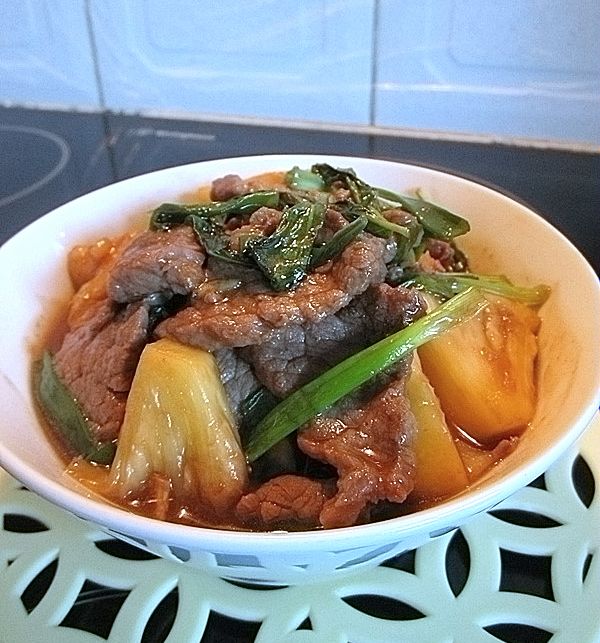 及以下步骤:只需翻炒片刻,熄火上碟。 烧热锅倒入少许橄榄油墨,将姜放入。 然后倒入腌制好的牛肉中火炒 烧热锅倒入少许橄榄油墨,将姜放入。 然后倒入腌制好的牛肉中火炒 炒到牛肉变色倒入一大勺蚝油,少许盐、糖、胡椒粉。 翻炒均匀加入菠萝。 将葱加入一起炒。 最后放入九层塔。 只需翻炒片刻,熄火上碟。