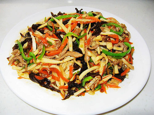 这个就是在传统的鱼香肉丝中加入了鲍菇丝,口感更丰富,同时增加了蔬菜的份量,也更健康。
