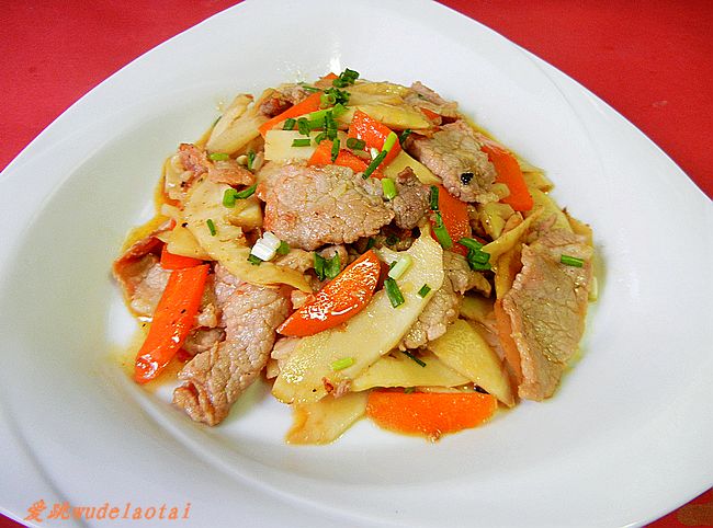 及以下步骤:加盐,鲜抽,鸡精,胡椒粉,葱花调味即可. 准备食才 猪腿肉洗净切片,用盐,料酒,姜,淀粉搅拌入味. 准备食才 猪腿肉洗净切片,用盐,料酒,姜,淀粉搅拌入味. 春笋去壳洗净切片,胡萝卜洗净切片 锅里油热,放下春笋,胡萝卜煸炒2分钟盛出 锅里油热,放下肉片煸炒 待肉片转色,放下春笋,胡萝卜煸匀,加点水,闷煮3分钟. 加盐,鲜抽,鸡精,胡椒粉,葱花调味即可.
