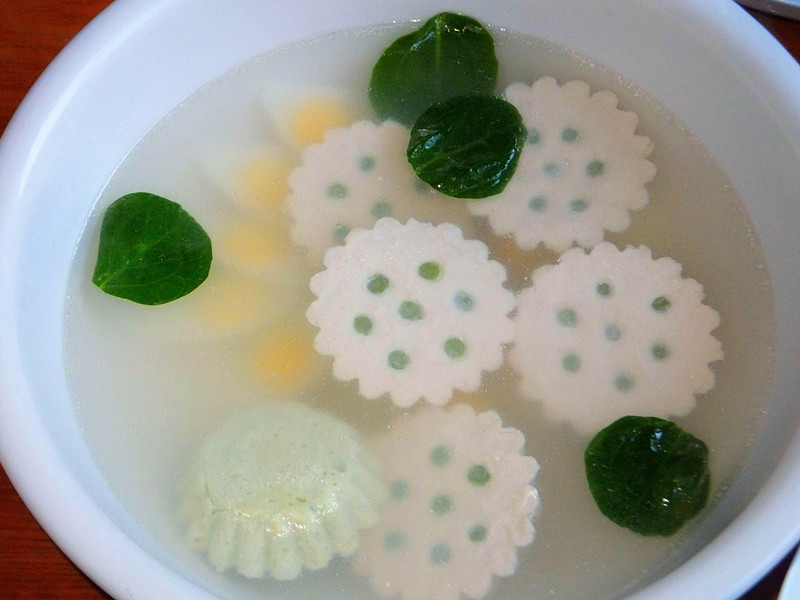 及以下步骤:将小圆形盘子里面抹上香油,将拌匀的鸡脯肉泥放进抹成圆形,再将放到蒸车蒸五分钟取出备用。 小汤匙里面抹上香油,再将鹌鹑蛋打开放到里面后蒸五分钟后取出 将蒸好的鹌鹑蛋取出,中间放上蒸好的鸡肉泥再蒸五分钟取出 锅内放鸡清汤烧开,加入精盐胡椒粉等调味后,将原料放入烧开,轻轻倒入少许汤盘中, 锅内放鸡清汤烧开,加入精盐胡椒粉等调味后,将原料放入烧开,轻轻倒入汤盆中即可。 将小圆形盘子里面抹上香油,将拌匀的鸡脯肉泥放进抹成圆形,再将放到蒸车蒸五分钟取出备用。 小汤匙里面抹上香油,再将鹌鹑蛋打开放到里面后蒸五分钟后取出 将蒸好的鹌鹑蛋取出,中间放上蒸好的鸡肉泥再蒸五分钟取出 锅内放鸡清汤烧开,加入精盐胡椒粉等调味后,将原料放入烧开,轻轻倒入少许汤盘中, 锅内放鸡清汤烧开,加入精盐胡椒粉等调味后,将原料放入烧开,轻轻倒入汤盆中即可。
