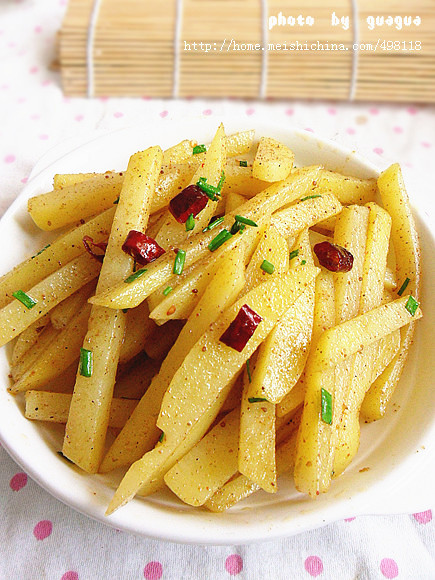 及以下步骤:沥干的土豆条放入,中小火,用筷子小心翻拌4分钟左右。(因为土豆煮过,用铲子容易铲碎) 加入适量的十三香。(不喜欢这种味道的童鞋可以换成烧烤粉来代替) 适量的孜然粉。 中小火,用筷子拌匀,等到调料粉都均匀地粘在在土豆条上后,撒上葱花,出锅。 个人觉得比油炸的薯条还好吃,很健康的做法。调料粉的量根据自己口味增减。 喜欢的童鞋可以收藏起来,有空试试。 适量的孜然粉。 中小火,用筷子拌匀,等到调料粉都均匀地粘在在土豆条上后,撒上葱花,出锅。 个人觉得比油炸的薯条还好吃,很健康的做法。调料粉的量根据自己口味增减。 喜欢的童鞋可以收藏起来,有空试试。