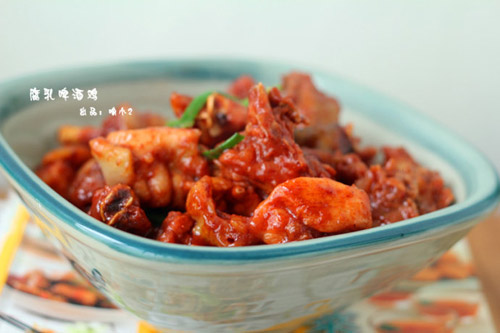 今天的主题是豆腐乳,传统在市面上看到的豆腐乳分为三种:红方、白方、青方。 红方:红辣、玫瑰的属于红方。 白方:甜辣、桂花、五香属于白方。 青方:其实就是臭豆腐,代表就是王致和。 而我入菜的豆腐乳是红方的一种,南方很多地方统称都叫南乳,其实每个地方制作的工艺都差不多,就我看来,差异化就是各个地方的豆腐制作的原材料和水有关系了,其它配料都是按照特有的红曲米、盐、黄酒或者白酒去发酵的。而南乳就是用天然的红曲米为着色剂,使得食材的表面呈红色。至于放白酒还是黄酒品尝之后一定能吃的出来。 在这里又继续谢谢南宁的好朋友#@老鱼家的戏#,友情赞助了我们这里买不到的广东南乳,一方面出于家里人喜欢吃这款口感的豆腐乳,搭配粥吃非常的好,另一方面我答应朋友做几道关于豆腐乳的菜品,也属于自己新的尝试,做菜很上瘾的,这次拿到豆腐乳我就在考虑做什么。现在我变得越来越挑剔了,关键是食材和调味品方面很重要,其实真正对于喜爱烹饪到骨子里面的人而言,这叫追求。 这次的食材我选用了当地吃谷子长大的鸡,足足花了我150大洋,我取半只,另外半只炖汤了。另外调味品就是一听啤酒、适量的南乳汁就ok了,不过在调味的当中会感觉咸,那就调和一些冰糖即可,这样的口感会更加的柔和,喜欢开胃的朋友也不会觉得这是重口味,浓郁的南乳味道完全包容在鸡的里面,这是一道不需要放任何传统调味品就能做到的菜,但是需要的是耐心和时间,至少要焖上一个小时方可,时间太短则太老,时间太长则太酥,就会失去鸡的嚼劲,失去鸡的口感。总是还是自己的一句话:做菜需要耐得住寂寞。
