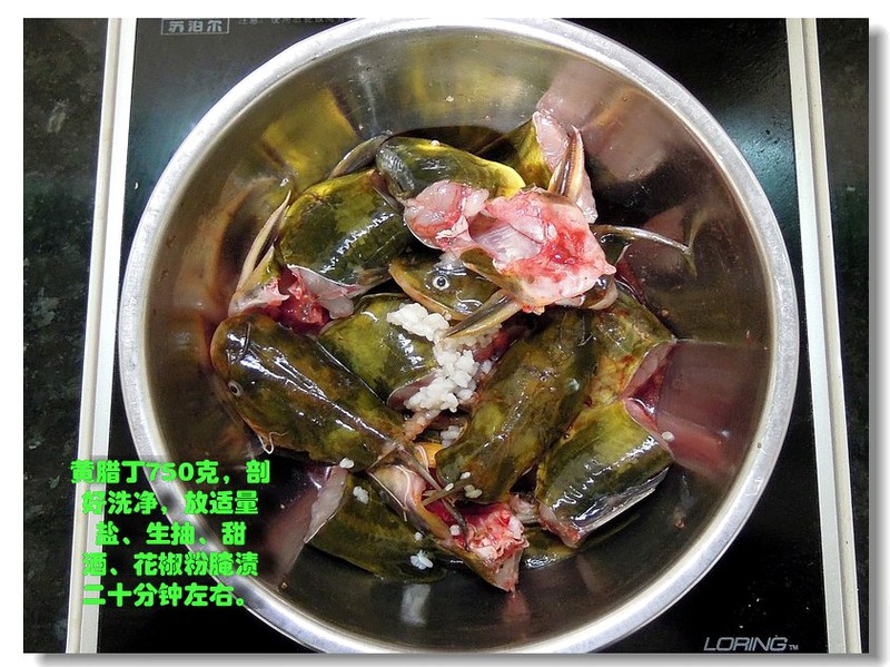 4、黄腊丁750克,剖好洗净,放适量盐、生抽、甜酒、花椒粉腌渍二十分钟左右