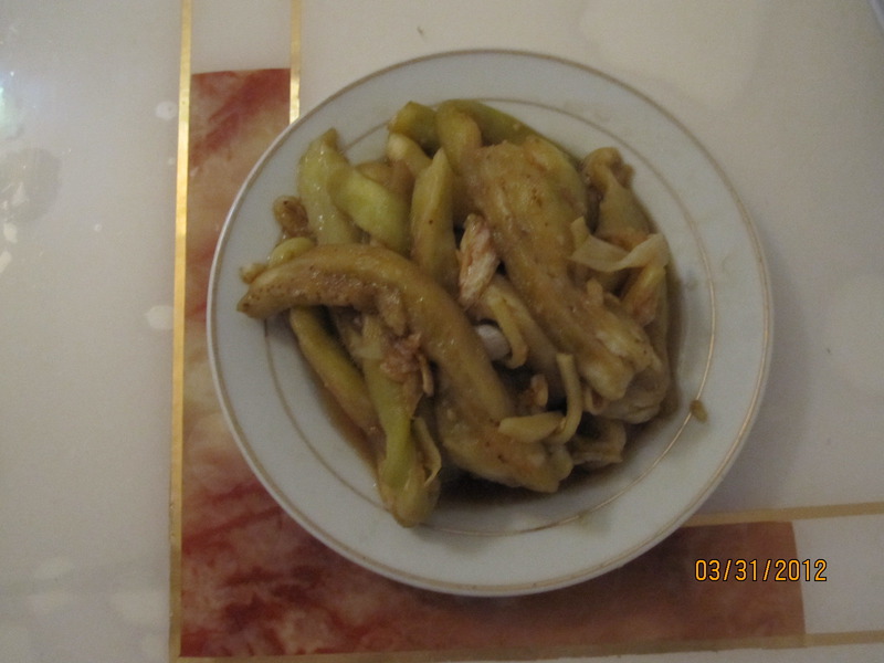6、将长茄子洗净去皮,葱、姜洗净
