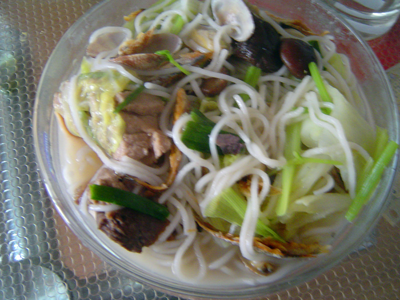 及以下步骤:锅里倒入少量油,下白菜、芹菜蒜翻炒。 倒入排骨汤,熟鱼干烧开 烧开后放入粉干、花蛤,倒入料酒继续煮到水开。 最后根据各人口味调味,我家口味较为清淡,只放了鱼露。口味重的可以放点盐和味(鸡)精。 最后的成品 锅里倒入少量油,下白菜、芹菜蒜翻炒。 倒入排骨汤,熟鱼干烧开 烧开后放入粉干、花蛤,倒入料酒继续煮到水开。 最后根据各人口味调味,我家口味较为清淡,只放了鱼露。口味重的可以放点盐和味(鸡)精。 最后的成品