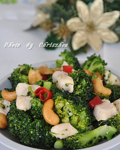 西兰花中的营养成分不仅含量高,而且十分全面,主要包括蛋白质、碳水化合物、脂肪、矿物质、维生素c和胡萝卜素等。在国外西兰花一般就是在水里焯一下,然后拿来做沙拉或者就蘸盐吃了。可是我们不习惯这么个吃法,一般总喜欢跟肉类炒在一起。今天我炒鸡丁,然后再放几颗腰果,除了点缀菜式,同时多加点坚果,可以增加点营养。