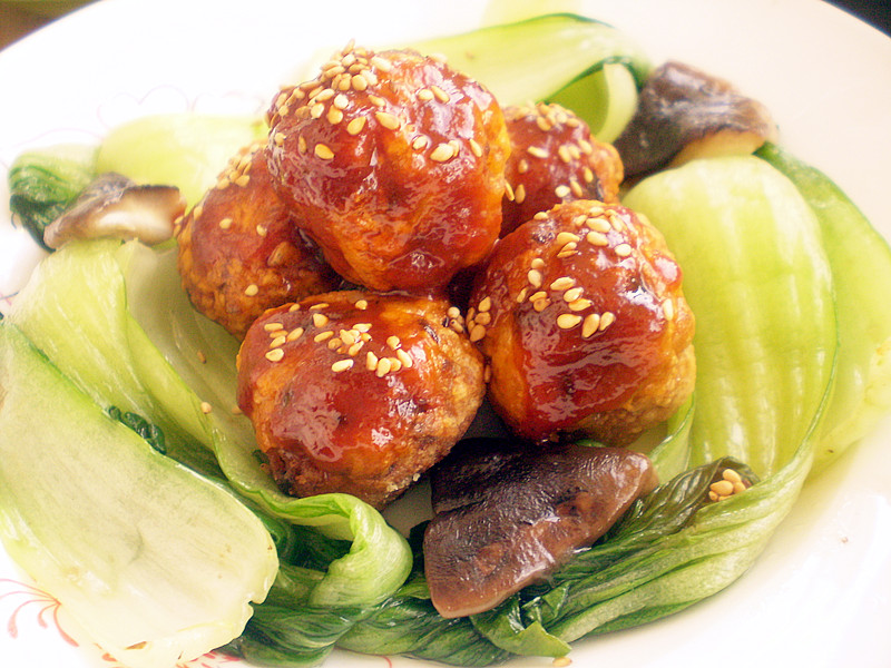及以下步骤:热锅下油,放入葱花,炒香,下油菜,看菜有点软塌,放入香菇,适量的盐,翻炒,关火放味精!盛出备用! 我们来熬个酸酸甜甜的酱汁吧,锅里放适量水,下番茄酱,醋,糖,熬至浓稠,关火,下入藕丸子! 摆盘吧,单吃丸子觉得一点菜也没有,所以配了些青菜,呵呵! 油到了7成热下丸子,改中小火,炸至金黄!出锅备用! 大概炸成这个样子就ok了! 香菇洗净,切成小块!备用! 油菜洗干净,我没有用刀切,就是劈开整棵的! 热锅下油,放入葱花,炒香,下油菜,看菜有点软塌,放入香菇,适量的盐,翻炒,关火放味精!盛出备用! 我们来熬个酸酸甜甜的酱汁吧,锅里放适量水,下番茄酱,醋,糖,熬至浓稠,关火,下入藕丸子! 摆盘吧,单吃丸子觉得一点菜也没有,所以配了些青菜,呵呵!