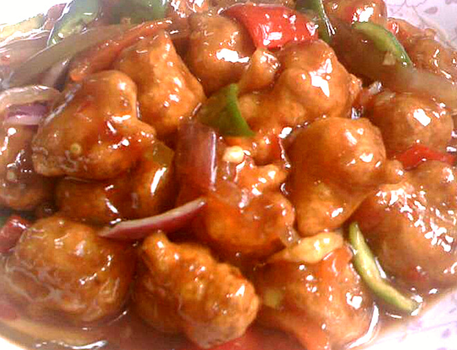 料酒(适量) / 生粉(适量) / 盐(适量) / 白糖(适量) / 洋葱(适量) / 鸡蛋(适量) / 面粉(适量) / 甜辣酱(适量) / 蒜茸(适量) / 茄汁(适量) / 红、青椒(适量) / 糖五柳菜(适量)
