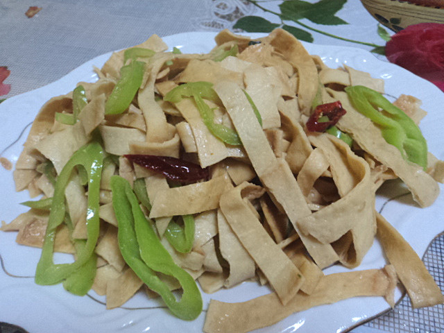 及以下步骤:倒入泡好的干豆腐皮翻炒熟就可以了 先用温水泡发干豆腐皮 辣椒斜切丝 先用温水泡发干豆腐皮 辣椒斜切丝 干辣椒两个用剪刀剪成丝 泡发好的豆腐皮切条 锅中倒油先放干辣椒 再放切好的青椒 倒入泡好的干豆腐皮翻炒熟就可以了