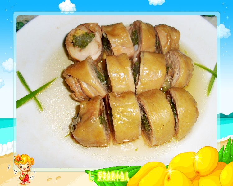 及以下步骤:洋葱切丝,不喜欢的可以不加,或是加一些自已喜欢的菜,比如香菇之类的都可以。 铺一张锡纸,把腌制好的鸡腿肉平铺上面,卷入辣椒丝,洋葱丝,卷起,慢慢卷,不然容易开的。 卷好,不要散开了。 用锡纸的一边将鸡腿肉卷裹紧,向另外锡纸一边卷起来,卷好后,侧面两边再收紧,拧成糖果的样子。注意最好不要把锡纸弄破。 三个都卷好了。 放蒸锅,等水烧开后,将卷好的鸡肉卷装盘放入蒸锅内,蒸25分钟即可。 蒸好后,取出,把锡纸剥掉。 切成小段就可以吃啦。 蒸好后,取出,把锡纸剥掉。 切成小段就可以吃啦。