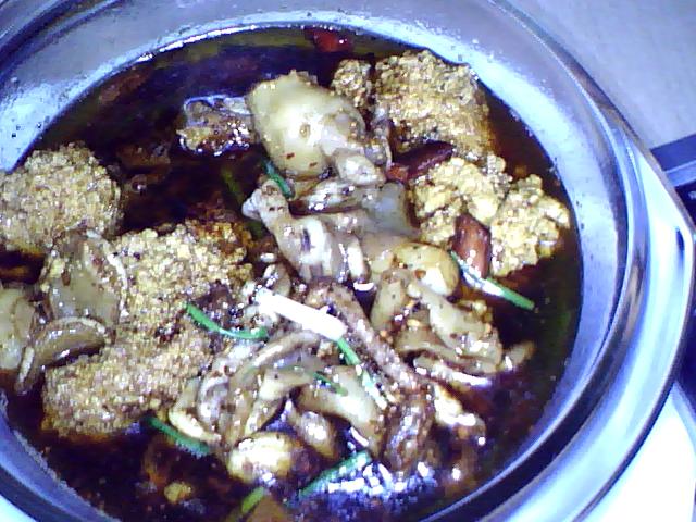 7、把鱼杂倒入锅中轻轻转动锅,待鱼杂变色后喷人料酒,加上调味料,加适量水,盖上锅盖,焖煮八成熟,开盖盛出,洒上香葱段待用