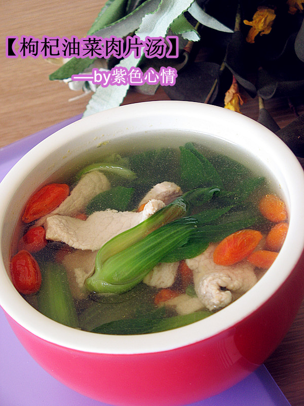 及以下步骤:出锅前加入适量盐。 加入枸杞和少许橄榄油,搅拌均匀就可以了。 材料集合图。将新鲜的小油菜洗干净,枸杞、猪肉和小葱都洗净备用。 将猪肉切片。 锅中加入适量清水烧沸,加入猪肉片焯30秒后捞出备用。 锅中加入适量高汤或清水烧开后放入焯过水的肉片,再次烧开后加入料酒,小火煮30分钟。 加入葱花。 加入新鲜的小油菜。 出锅前加入适量盐。 加入枸杞和少许橄榄油,搅拌均匀就可以了。