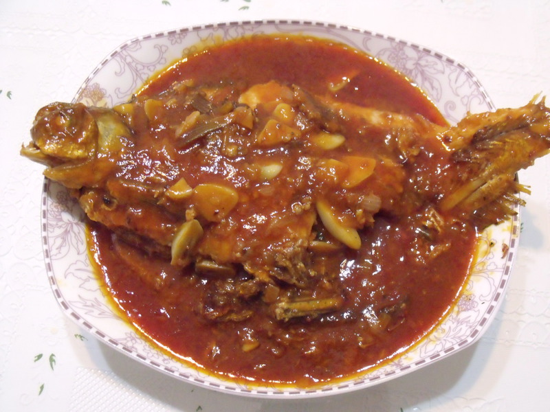 6、蒜头切片,锅入油放蒜头煎香,加番茄酱煸香一会加水、少许盐、蒸鱼豉油、糖、一点醋, 大火烧开,小火收汁,收好汁后浇开鱼身上即可