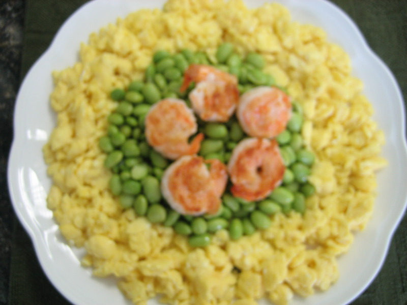 鸡旦、虾都是高蛋白食物;青豆是绿色食品,含有丰富的叶绿素,所以,这款菜的营养搭配还比较全面。色泽上是红、黄、绿,很抢眼,有食欲。因为没有加过多的调味品,吃起来的味道是清淡、原味。