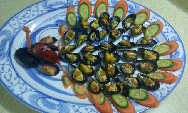 7、每只海虹的两片贝壳分开成对对称排在盘里,另取其他的海虹肉摆到空壳里,这样的做出的孔雀羽翎外观漂亮