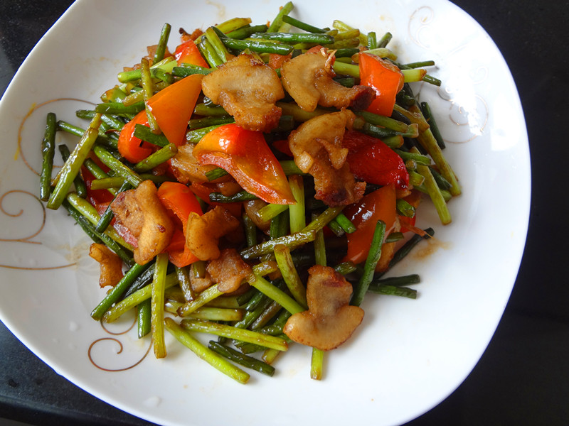 及以下步骤:蒜薹洗净切段,甜椒切段。 炼猪油的步骤我就省了,这个很简单,肥猪肉切丁,锅内加少许油放进去炼就行了。要小火慢炼,要不得烧黑了。现在市场里很多蒜苗卖。我们这里称之蒜苗,书上叫蒜薹。别搞混了。 蒜薹洗净切段,甜椒切段。 炼猪油的步骤我就省了,这个很简单,肥猪肉切丁,锅内加少许油放进去炼就行了。要小火慢炼,要不得烧黑了。现在市场里很多蒜苗卖。我们这里称之蒜苗,书上叫蒜薹。别搞混了。 蒜薹洗净切段,甜椒切段。 炼猪油的步骤我就省了,这个很简单,肥猪肉切丁,锅内加少许油放进去炼就行了。要小火慢炼,要不得烧黑了。现在市场里很多蒜苗卖。我们这里称之蒜苗,书上叫蒜薹。别搞混了。 蒜薹洗净切段,甜椒切段。 锅内下油,烧热,先放蒜薹翻炒。 然后放甜椒,最后蒜薹炒熟时再放入油渣,调入盐,生抽。 一定要出锅前放油渣,太早放油渣就不脆了,绵绵的。
