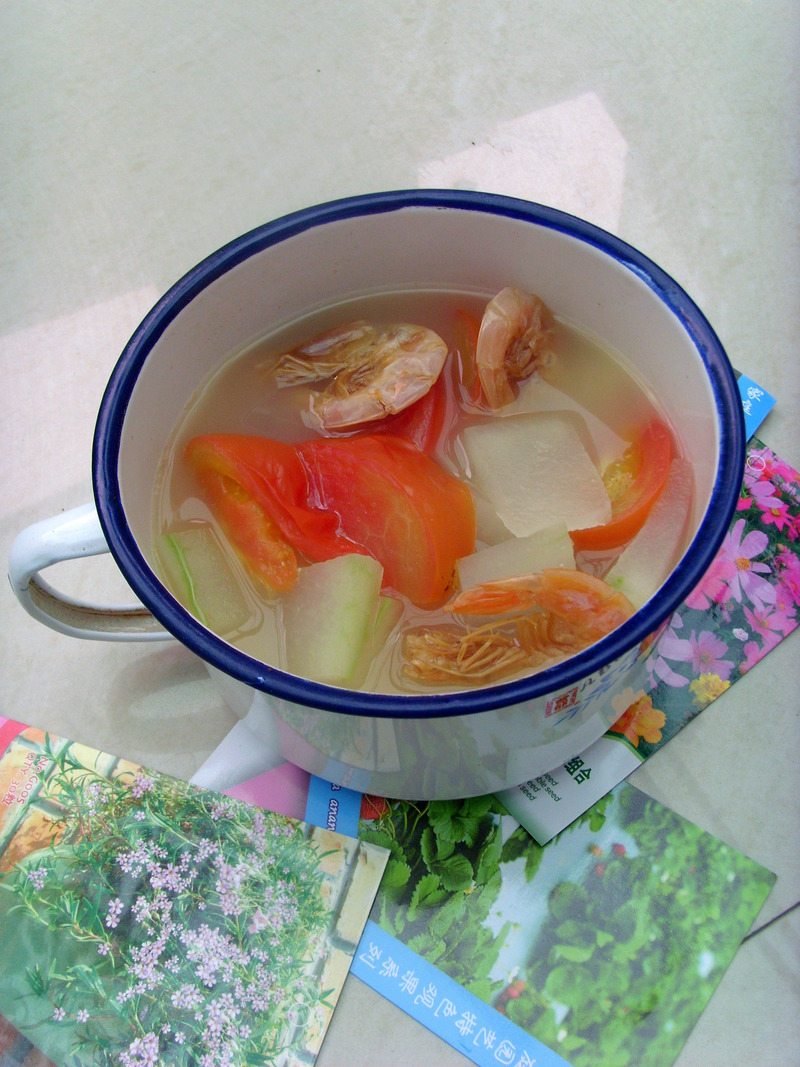及以下步骤:准备的材料:番茄、冬瓜、虾干 将所有材料一起放进锅中,放入清水煮,关火之前放入盐和鸡精调味即可。 准备的材料:番茄、冬瓜、虾干 将所有材料一起放进锅中,放入清水煮,关火之前放入盐和鸡精调味即可。 准备的材料:番茄、冬瓜、虾干 将所有材料一起放进锅中,放入清水煮,关火之前放入盐和鸡精调味即可。 准备的材料:番茄、冬瓜、虾干 将所有材料一起放进锅中,放入清水煮,关火之前放入盐和鸡精调味即可。 盖上锅盖,煮开,焖一会就可以了 制作相当简单,口味鲜美!