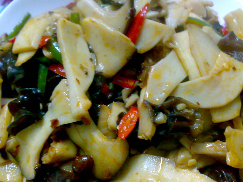 3、热锅,锅烫手时放油,爆香豆豉,依次将辣椒、木耳和姑子放入锅内翻炒,待姑子软化后,放盐调味,最后乘盘出锅即可了。愿意的话可以放点香油~~~