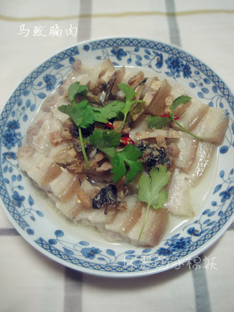 及以下步骤:这道菜用的是五花肉,最好能半冻的肉,方便切 从巽寮湾带回来的马鲛鱼 这道菜用的是五花肉,最好能半冻的肉,方便切 从巽寮湾带回来的马鲛鱼 这道菜用的是五花肉,最好能半冻的肉,方便切 从巽寮湾带回来的马鲛鱼 把五花肉切成宽4cm左右厚0.5cm左右均匀的块,在盘中摆好。 马鲛鱼取出切碎 放在腩肉上 放在电饭煲上,做饭时一起蒸熟,取出撒上香菜