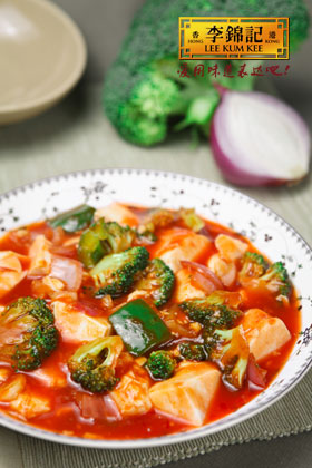 及以下步骤:将6放入盘中后,摆放上2中的西兰花即可。 将青椒切片,洋葱切成适当大小。 西兰花切成小扇形片并放入滚水中汆烫2分钟,捞起沥干。 将青椒切片,洋葱切成适当大小。 西兰花切成小扇形片并放入滚水中汆烫2分钟,捞起沥干。 将豆腐放入滚水中汆烫2分钟,捞起沥干。 切成3公分厚正方形。 将番茄沙司、糖、醋、洋葱、大蒜、青椒的材料混合烧热,以生粉勾薄芡。 加入做法4的豆腐略拌炒下后一起焖煮。 将6放入盘中后,摆放上2中的西兰花即可。