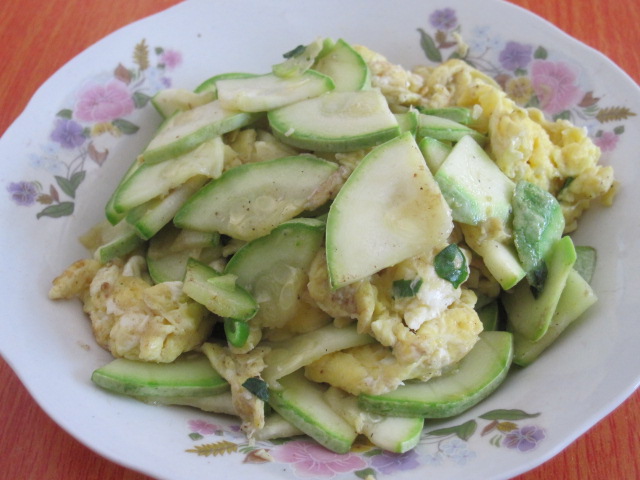 4、将鸡蛋拨到一旁,放西葫芦片翻炒
