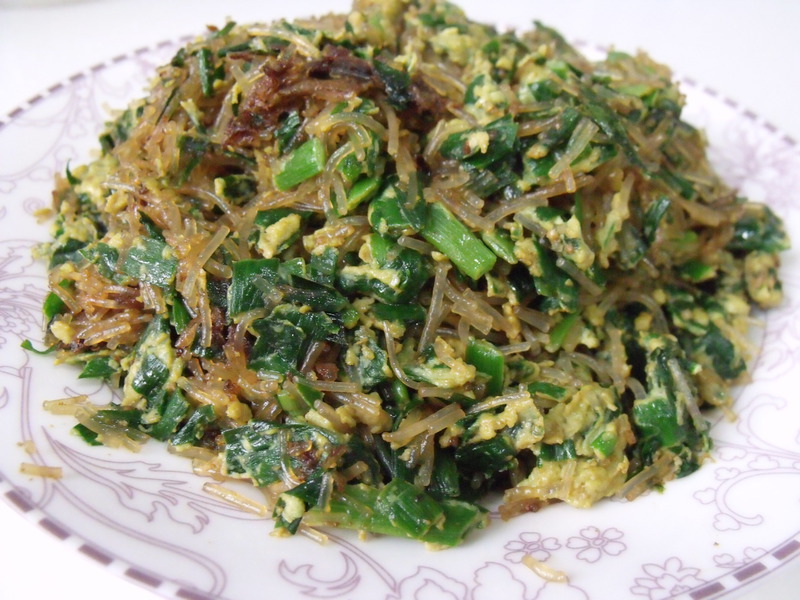 及以下步骤:装盘即可 韭菜洗净切成小末 粉丝用开水泡一会,凉水洗净,也切成小末状 韭菜洗净切成小末 粉丝用开水泡一会,凉水洗净,也切成小末状 韭菜末放一碗中,放入粉丝末,搅拌一下 打入两三个鸡蛋再次搅匀,放适量盐、糖搅拌均匀 锅中放少许油,烧热,放入搅拌好的韭菜,翻炒至鸡蛋凝固 再加老抽炒均匀出香 装盘即可