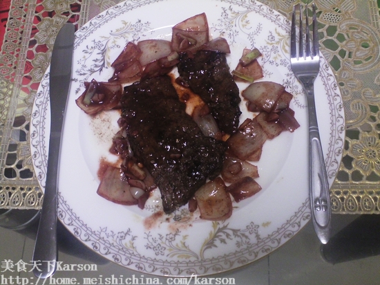 及以下步骤:煎锅倒入一点油,摇匀。 放入牛肉,小火煎5-7分钟(看肉是否够嫩,越嫩时间越短。) 注过水的肉让人真头疼。。。 捞出牛肉,倒掉锅里的水,重新起一点点油,煎另一面。(如果你买的肉很好,则直接翻面即可,不用另起油锅。) 煎另一面,5-7分钟。(视牛肉质量而定。) 把煎熟的牛肉盛出待用。 洋葱切片,蒜切末。(洋葱最好也切末,不过我的眼睛实在是被辣的受不了,匆匆切了几刀就算了事。。) 锅内倒一点油,放入洋葱和蒜末炒香。 待洋葱炒软后再次倒入一些红酒(以将要没过洋葱为宜,不要太多。),加三勺黑胡椒粉,一勺盐,一点番茄酱。 大功告成!