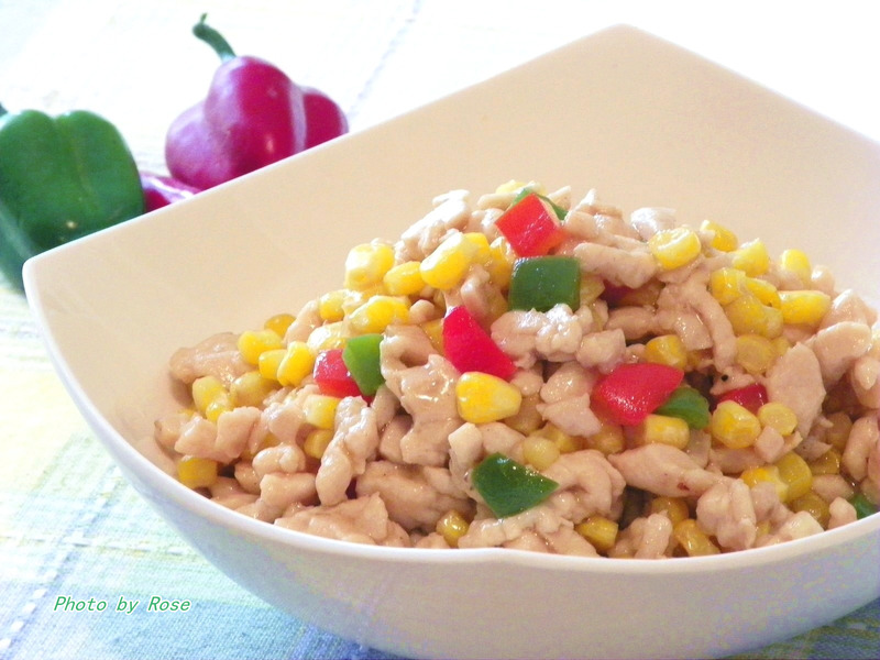 玉米(小半碗) / 青菜椒(1/2个) / 红菜椒(1/2个) / 生抽-碗汁(1茶匙) / 糖-碗汁(1/4茶匙) / 胡椒粉-碗汁(1/4茶匙) / 玉米淀粉-碗汁(1茶匙) / 水-碗汁(小半碗) / 麻油-碗汁(1/4茶匙) / 盐-腌制(约1/4茶匙) / 糖-腌制(约1/6茶匙) / 胡椒粉-腌制(约1/4茶匙) / 料酒-腌制(约1/2茶匙) / 玉米淀粉-腌制(1/2茶匙) / 水-腌制(1汤匙) / 菜油-腌制(1/2茶匙) / mandarin sauce(1汤匙)